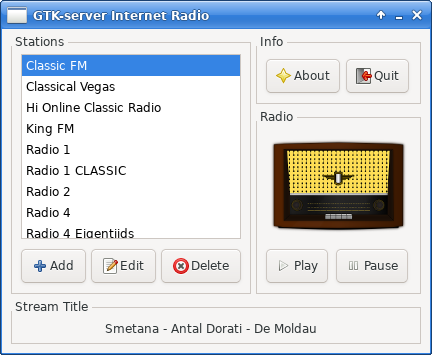 - An internet radio program to play MP3 streams in BASH. This program can be found in the latest source package, also the Kornshell version. It demonstrates the use of the Highlevel Universal GUI (HUG). I am actually using this program to listen to internet radio channels. Linux screenshot: