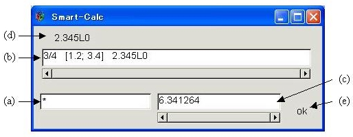 The Smart-Calc is a simple GUI for numerical calculations attached on clisp using the gtk-server. As Common LISP deals with fractional numbers, complex numbers, and long numbers, which is one of the advantages of this language, this simple calculator can also deal with these numbers. The Smart-Calc is much easier to use than conventional scientific calculators. The Smart-Calc is really convenient for me. I hope it is useful for other people as well.Takafumi SHIDO
